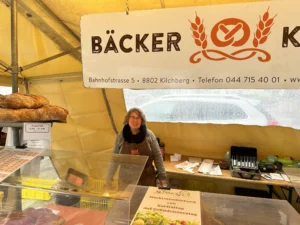 Frau Bürgi von der Bäckerei-Konditorei- Kafi Känzig bedient selbst bei stärkstem Regenwetter die Kundschaft am Adliswiler Wochenmarkt.